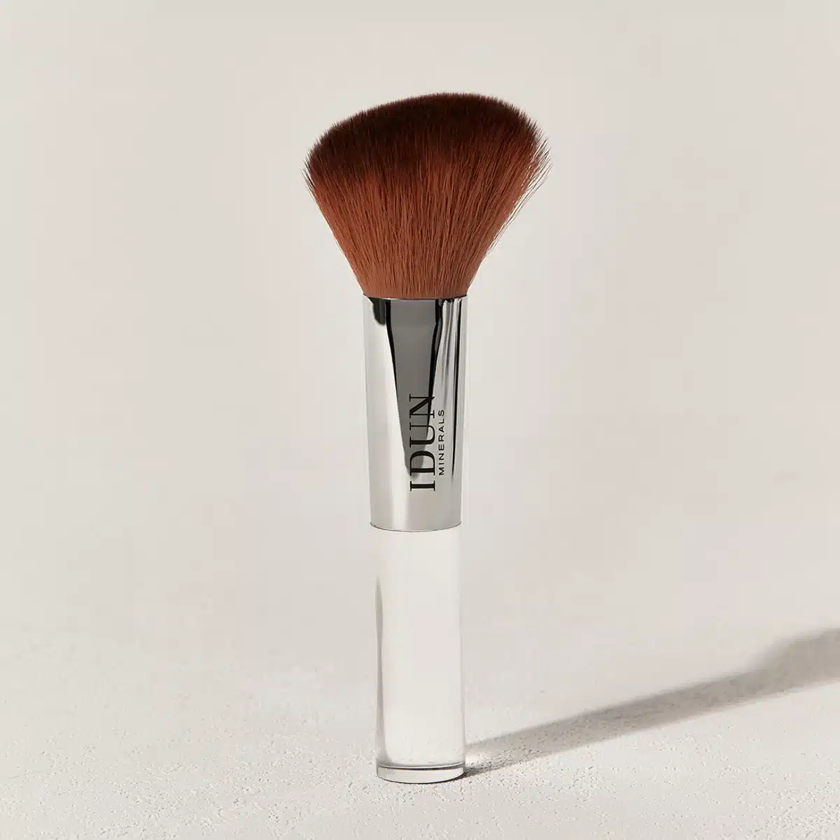 Lush, slanted brush for intuitive, perfect application. IDUN Minerals Bronzer / Blush Brush lines supple-soft bristles in an angled slant for easy application of angled contour bronzing lines and swift hints of blushing colour. A luxurious blending buffer that sweeps on the perfect amount of product every time.