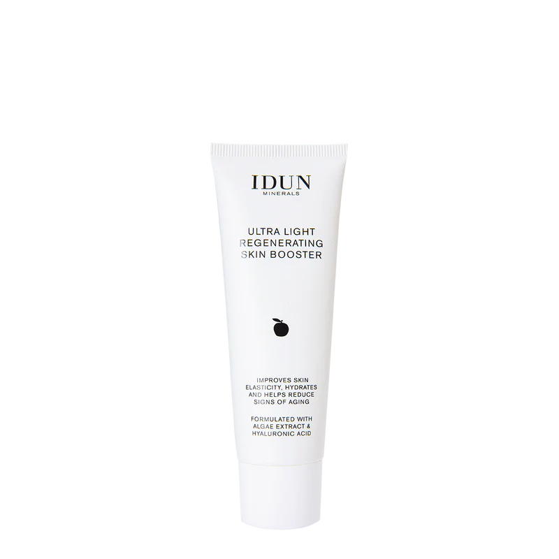 For smooth & hydrated skin. Helps reducing signs of ageing and improves skin elasticity. IDUN Minerals Ultra Light Regenerating Skin Booster refreshes and smoothens the skin as the lightweight vegan formula is quickly absorbed leaving skin radiant and hydrated. Formulated with algae extract, a natural ingredient with high content of B vitamins and amino acids, which has similar properties to retinoid without the unwanted side effects (irritation of the skin) for a reduced appearance of wrinkles and pigmentation, hyaluronic acid for a rejuvenating effect by improving skin elasticity and reducing deep wrinkles significantly and moisturizing Swedish canola oil and Nordic oat oil.