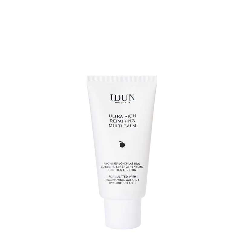 For soft & strengthened skin. Soothes the skin and provides long-lasting moisture. IDUN Minerals Ultra Rich Repairing Multi Balm moisturizes, protects and repairs as the rich, creamy, vegan formula wraps skin in caring ingredients. The unique water-in-oil formula retains moisture in the skin and is infused with rejuvenating hyaluronic acid, 3% niacinamide and moisturizing Swedish canola and Nordic oat oil, the creamy balm ensures long-lasting moisture of the skin.